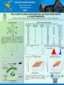 O trabalho apresentou um processo de reciclagem química (glicólise) do PBS utilizando 1,4-butanodiol e bicarbonato de sódio como catalisador limpo e econômico. O planejamento experimental permitiu despolimerizar o material em oligômeros e monômeros (~85%), seguido de repolimerização enzimática, demonstrando a circularidade do ciclo de vida e o potencial do PBS como matéria-prima para novos poliésteres.